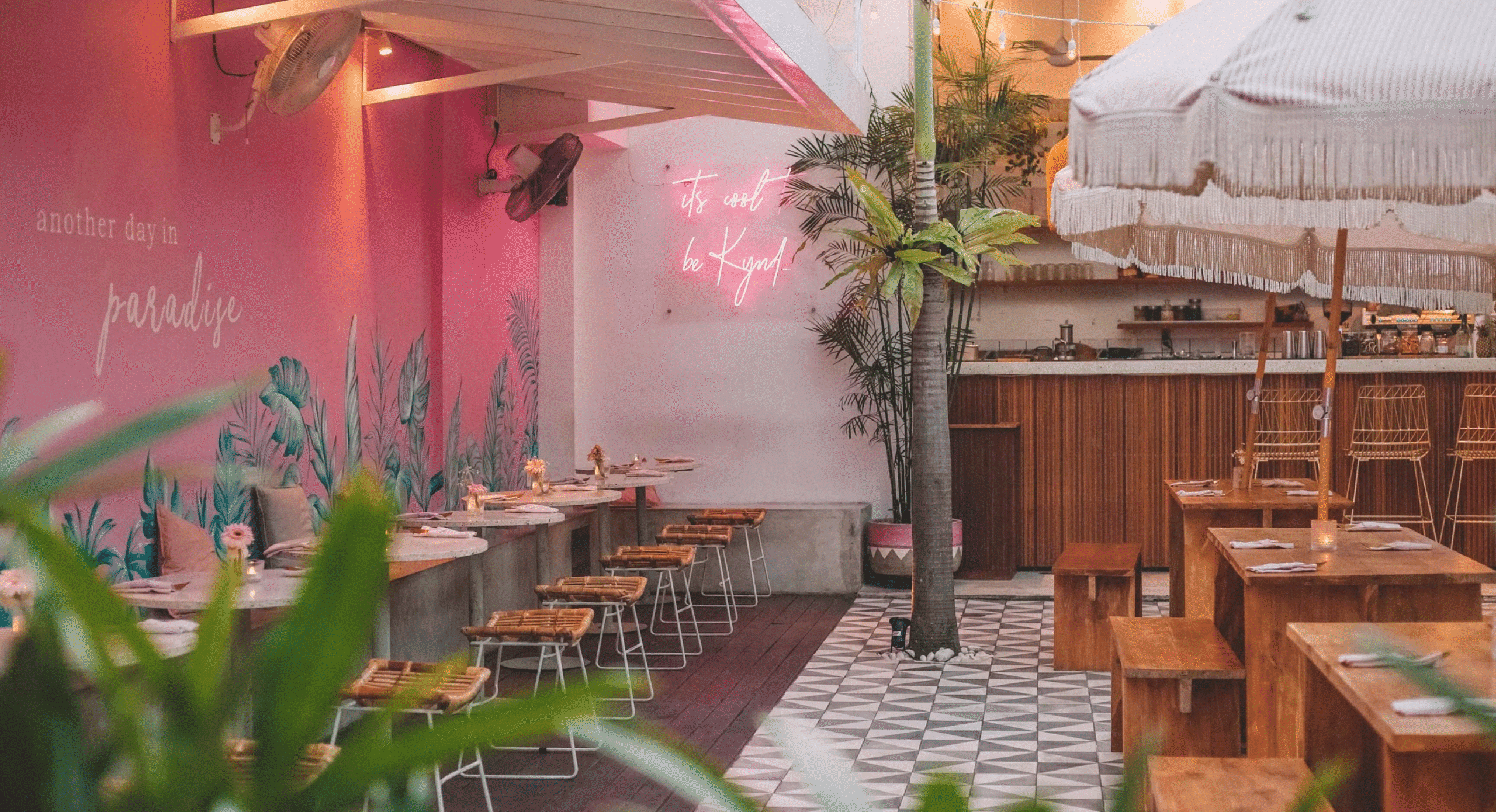 Bali has no shortage of photogenic cafés, but Kynd Community stands out for its lush pink walls, palm-lined courtyard, and artful plant-based menu that looks as good as it tastes. Smoothie bowls adorned with fresh tropical fruit spell out inspirational words, while pastel lattes come in shades of turquoise and blush. Beyond aesthetics, Kynd is a celebration of conscious living, making it the ultimate indulgence for wellness-minded travellers.