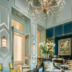 Interiors weave together pale‑green linen sofas, dark floral prints, tall mirrored wardrobes, and oak‑panelled ceilings to create villas that feel both fashion‑forward and timeless.
