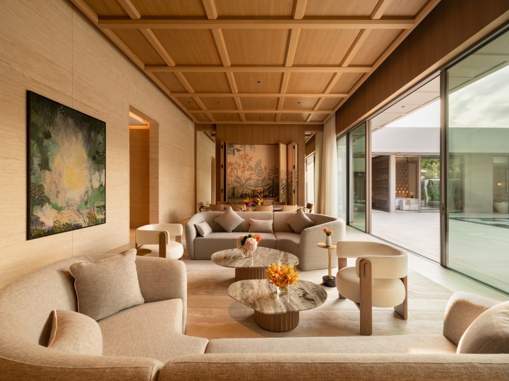 The Presidential Villa, at around 515 square meters, unfolds across three pavilions around a central pool, offering a “resort within a resort” atmosphere, while the expansive Royal Villa delivers four bedrooms and a vast living room designed for glamorous gatherings. The overall effect is a modern tropical estate: polished yet relaxed, luxurious yet unpretentious.